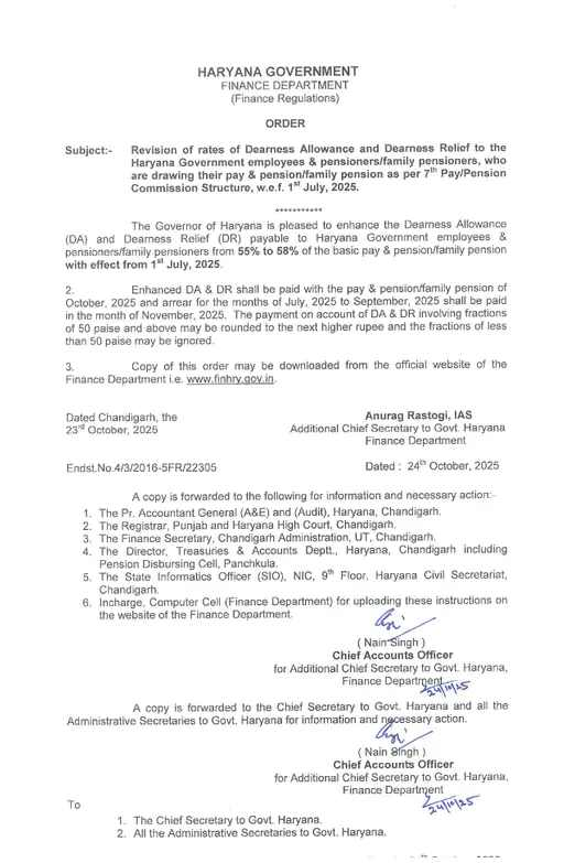 हरियाणा में 55 प्रतिशत से बढ़ाकर 58 प्रतिशत किया DA