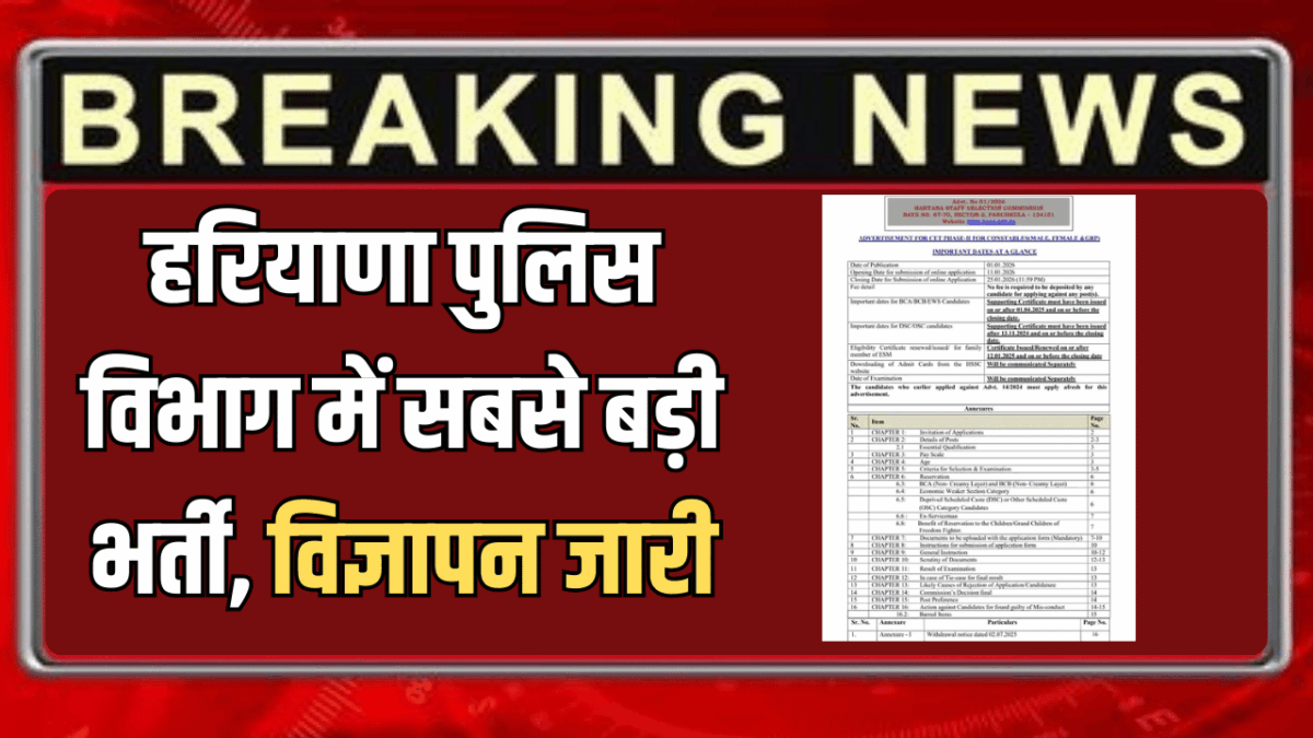 Haryana Police Bharti : हरियाणा स्टाफ सिलेक्शन कमीशन (HSSC) ने 5500 पदों पर हरियाणा पुलिस कॉन्स्टेबल भर्ती का नोटिफिकेशन जारी किया है। जो कि हरियाणा पुलिस के इतिहास की सबसे बड़ी भर्ती होगी। अभी तक 5061 पदों पर सबसे बड़ी भर्ती हुई है। नायब सरकार ने नए साल पर युवाओं को तोहफा दिया है।