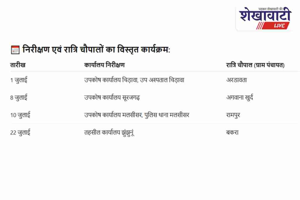 झुंझुनूं, जिला प्रशासन ने जुलाई 2025 माह के लिए प्रशासनिक निरीक्षण और रात्रि चौपालों का शेड्यूल जारी किया है। यह कार्यक्रम जिला कलेक्टर डॉ. अरुण गर्ग के निर्देशानुसार आयोजित किए जाएंगे।
