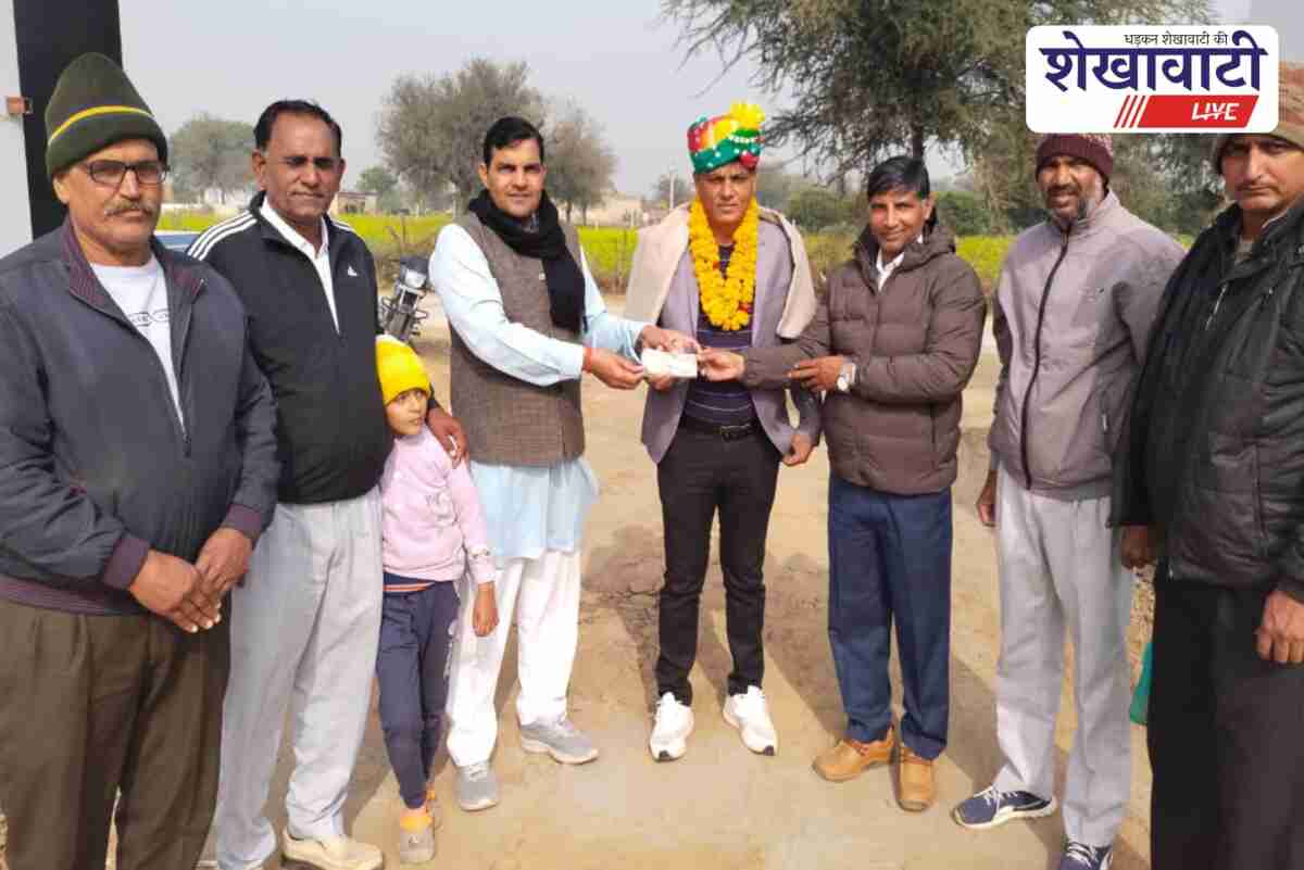 सुलताना (झुंझुनूं)। सुलताना बाईपास के जोड़ियां रोड स्थित क्यामसर तेजाजी मंदिर के निर्माण कार्य को लेकर जनसहयोग लगातार मिल रहा है। इसी क्रम में दक्षिका प्रोपर्टीज के डायरेक्टर एवं तेजा भक्त जगदीश पूनियां द्वारा मंदिर निर्माण के लिए 51 हजार रुपये नकद एवं निर्माण सामग्री देने की घोषणा की गई।