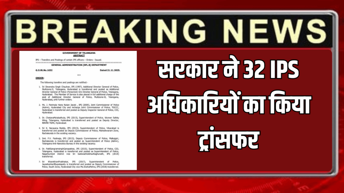 IPS Transfer 2025: एक बार फिर तबदला एक्सप्रेस देखने को मिली है। राज्य सरकार ने एक साथ 32 IPS अधिकारियों का तबादला किया है । जानकारी के लिए बता दे कि तेलंगाना पुलिस विभाग में बड़ा फेरबदल किया गया है। सरकार ने एक साथ 32 IPS अधिकारियों का तबादला किया है और अब उन्हें नए पद की जिम्मेदारी सौंपी गई है। यहां देखें पूरी लिस्ट