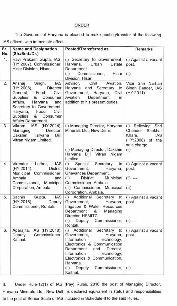 इनके अलावा पांच और आईएएस को मौजूदा जिम्मेदारियों के साथ अतिरिक्त जिम्मेदारी दी है।Haryana IAS Transfer List
