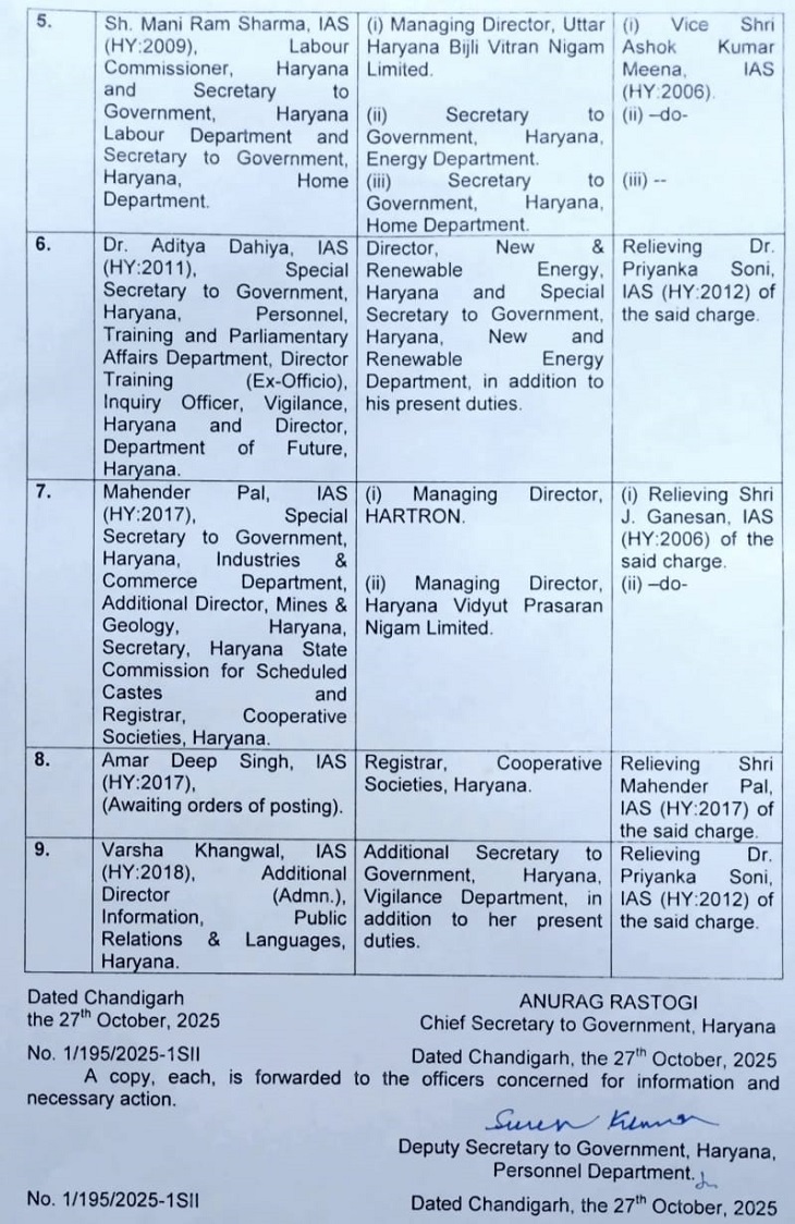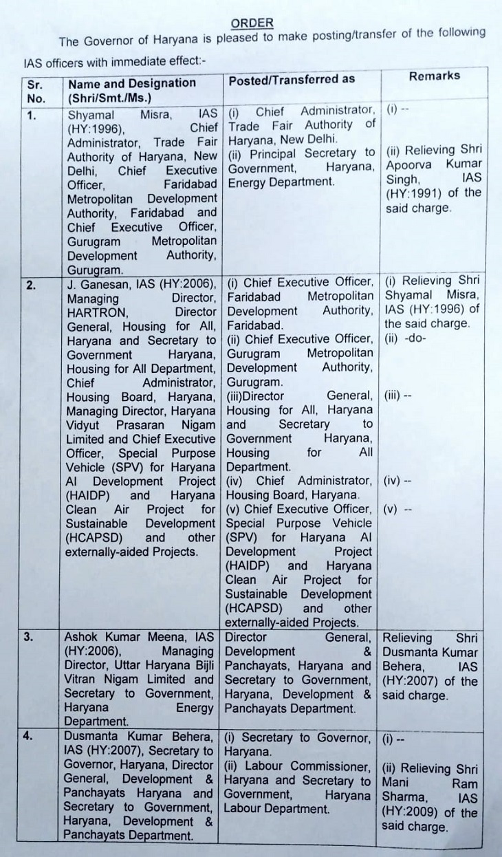 वहीं, 2006 बैच के आईएएस अधिकारी जे. गणेशन को फरीदाबाद और गुरुग्राम मेट्रोपॉलिटन डेवलपमेंट अथॉरिटी का चीफ एग्जीक्यूटिव ऑफिसर बनाया गया है।