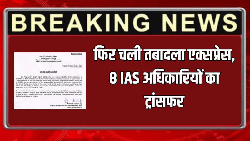 Posted inताजा खबर IAS Transfer and Posting Order: फिर चली तबादला एक्सप्रेस, 8 IAS अधिकारियों का ट्रांसफर ऑर्डर, देखने लिस्ट by Anil Choudhary13 नवम्बर 202513 नवम्बर 2025