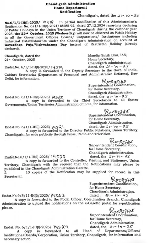 चंडीगढ़ प्रशासन की तरफ से मंगलवार (21 अक्टूबर) को नोटिफिकेशन जारी किया गया।