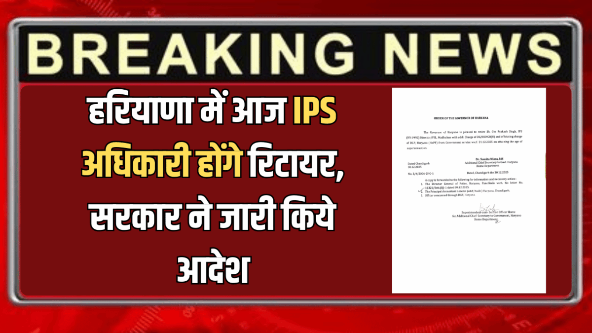IPS officers will retire today in Haryana : हरियाणा में आज दो सीनियर IPS अधिकारी रिटायर होने वाले है। बता दे कि सरकार ने 2 वरिष्ठ IPS अधिकारियों को सेवानिवृत्त करने के आदेश जारी किए हैं। इनमें 1992 बैच के IPS अधिकारी ओम प्रकाश सिंह 31 दिसंबर 2025 को रिटायर होंगे। वह निदेशक FSL मधुबन के साथ-साथ DGP का अतिरिक्त प्रभार संभाल रहे थे। इनके रिटायर होने के बाद 1 जनवरी को हरियाणा को नया DGP मिलेगा।