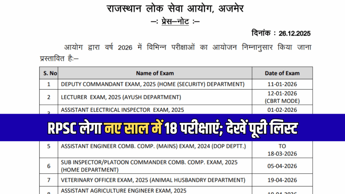 जानकारी के लिए बता दे की ने साल पर आरपीएससी की परीक्षाओं की शुरुआत 11 जनवरी 2026 से होगी। पहले ही दिन डिप्टी कमांडेंट परीक्षा-2025 आयोजित की जाएगी। इसके तुरंत बाद 12 जनवरी को आयुर्वेद विभाग के लेक्चरर की परीक्षा होगी।