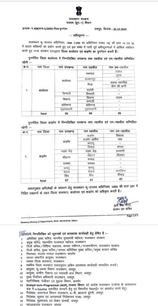 संशोधन के बाद बाड़मेर जिले में 7 उपखंड, 11 तहसील और 7 उपतहसील शामिल की गई हैं.