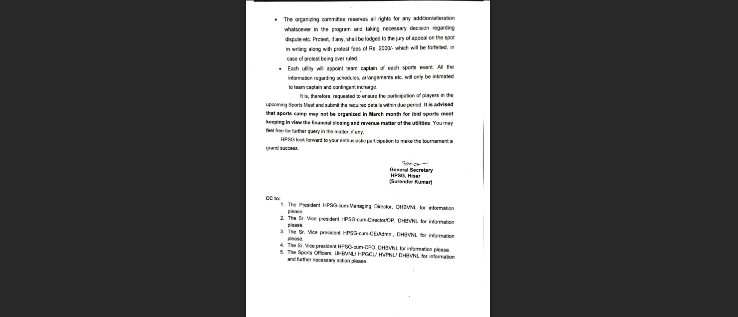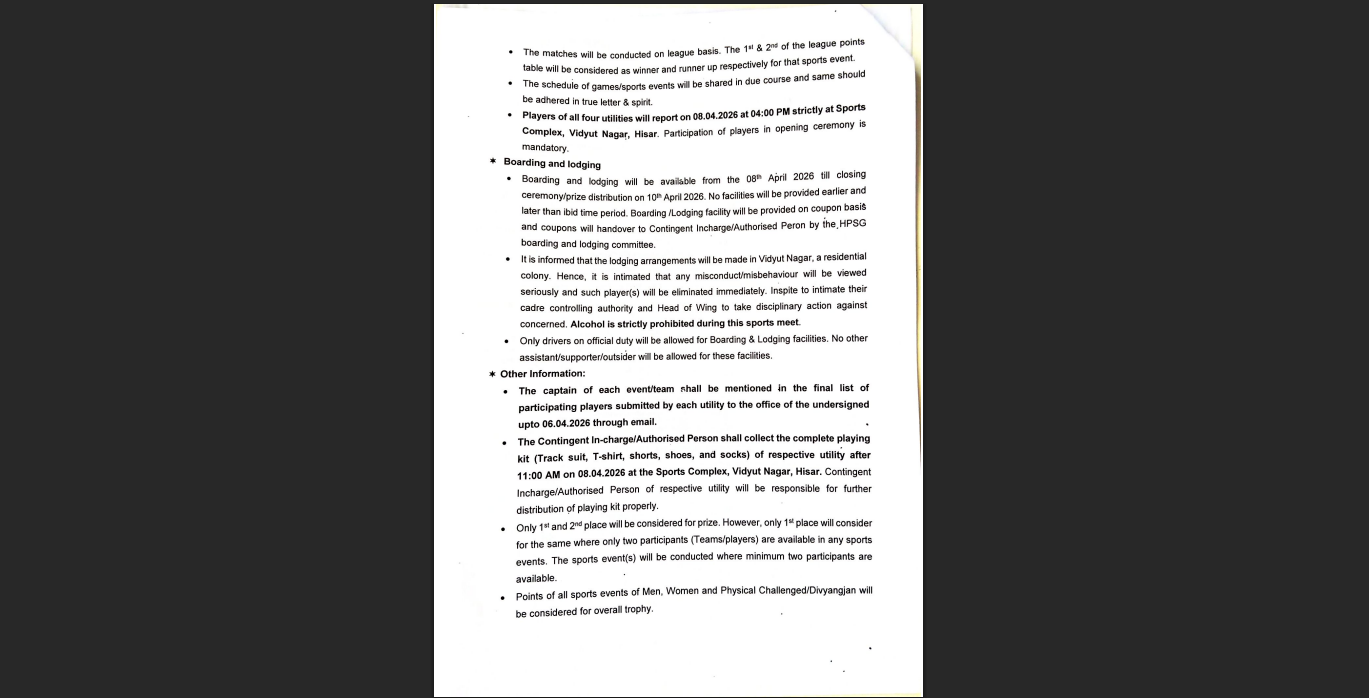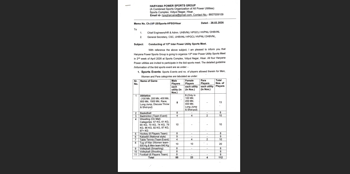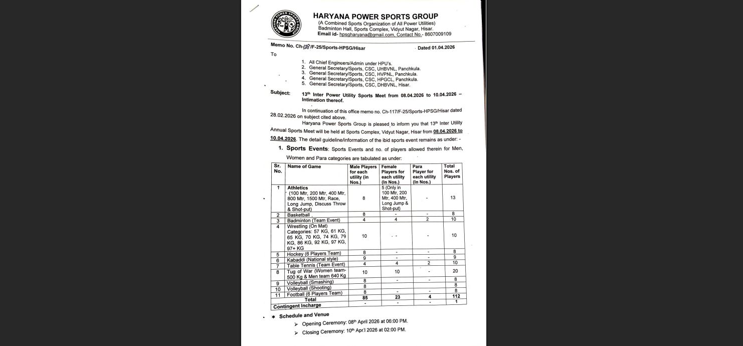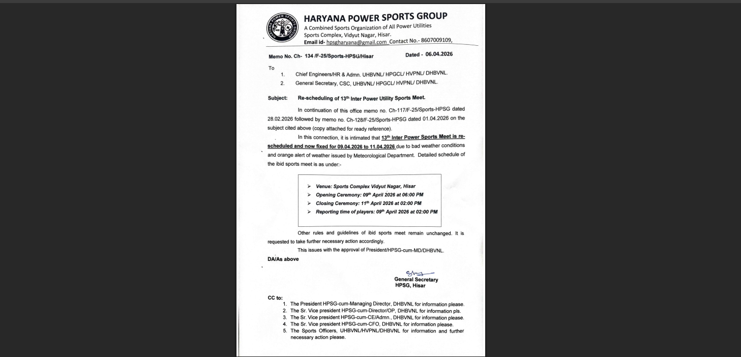 Haryana News : हरियाणा में बदलते मौसम की मार अब विधुत विभाग के होने वाले इंटर यूटिलिटी खेलों पर भी देखने को मिली है।