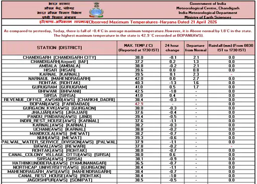 भिवानी में 42.5 डिग्री सेल्सियस, नारनौल में 42.0 डिग्री सेल्सियस, गुरुग्राम और सिरसा में 41 डिग्री सेल्सियस दर्ज किया गया। रोहतक, हिसार और करनाल सहित कई शहरों में पारा 39 से 40 डिग्री सेल्सियस के बीच रहा।