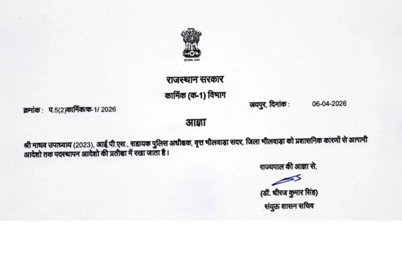 IPS Madhav Upadhyay: भीलवाड़ा सदर में तैनात 2022 बैच के आईपीएस अधिकारी माधव उपाध्याय की संदिग्ध भूमिका सामने आने के बाद राज्य सरकार ने सोमवार को उन्हें तत्काल प्रभाव से एपीओ (वेटिंग पोस्टिंग ऑर्डर) बना दिया है।