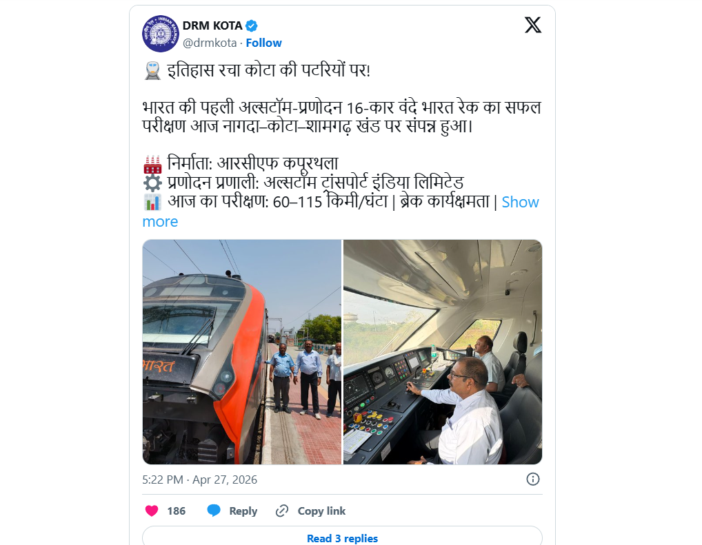 ट्रायल रेक (ट्रेन के डिब्बों का पूरा सेट) ने सभी स्थायी और अस्थायी गति प्रतिबंधों का पालन करते हुए नागदा-कोटा खंड पर परीक्षण पूरा किया। इसकी अधिकतम गति 180 किलोमीटर प्रतिघंटा होगी। – सौरभ जैन, सीनियर डिवीजनल कमर्शियल मैनेजर, कोटा