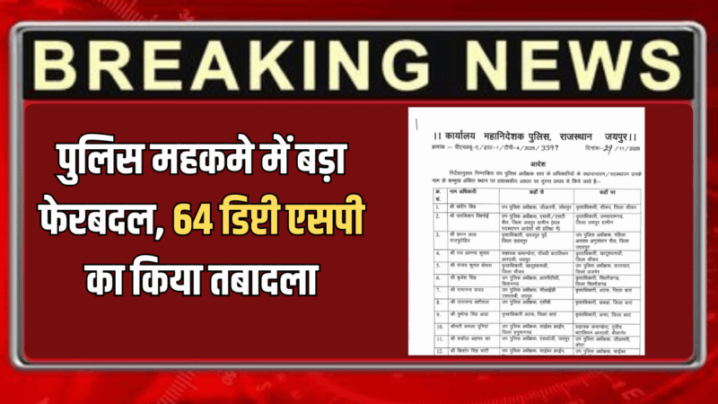 Posted inRajasthan News (राजस्थान समाचार) Transfer List 2025: लगातार दूसरे दिन राजस्थान पुलिस महकमे में बड़ा फेरबदल, सीकर समेत इन शहरों में 64 डिप्टी एसपी का किया तबादला; देखें पूरी लिस्ट by Anil Choudhary29 नवम्बर 202529 नवम्बर 2025