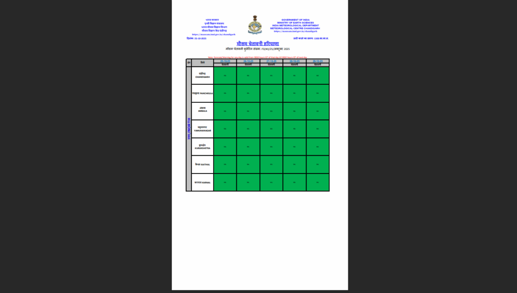 अधिक जानकारी के लिए बता दे की मौसम विभाग ( IMD update ) के अनुसार राज्य में 9 नवंबर तक मौसम शुष्क रहने की संभावना है। इस दौरान सुबह और रात के तापमान में और गिरावट हो सकती है, जबकि दिन के समय हल्की धूप निकलने की संभावना बनी रहेगी। बीते दिन सोनीपत और हिसार की रात सबसे ठंडी रही।
