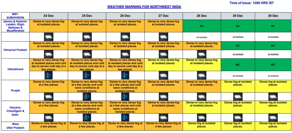 25 और 26 दिसंबर को उत्तराखंड में घने से बहुत घने कोहरे और कुछ स्थानों पर अत्यधिक ठंड की स्थिति होने की संभावना है। 27 और 28 दिसंबर को अलग-अलग स्थानों पर घने से बहुत घने कोहरे की संभावना है।