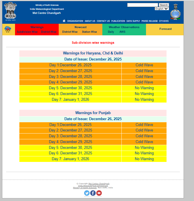 IMD के नए अपडेट के मुताबिक बता दे कि प्रदेश में 26 से 30 दिसंबर तक शीतलहर चलने की संभावना जताई गई है। इस दौरान प्रदेश में सूखी ठंड का असर देखने को मिलेगा। पूरे प्रदेश में ठंड को लेकर ऑरेंज अलर्ट जारी किया गया है।
